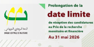 La Banque Centrale de Mauritanie (BCM) annonce le report de la date limite de réception des candidatures au Prix de la recherche monétaire et financière au 31 mai 2026, doté de 200 000 ouguiyas nouvelles.
